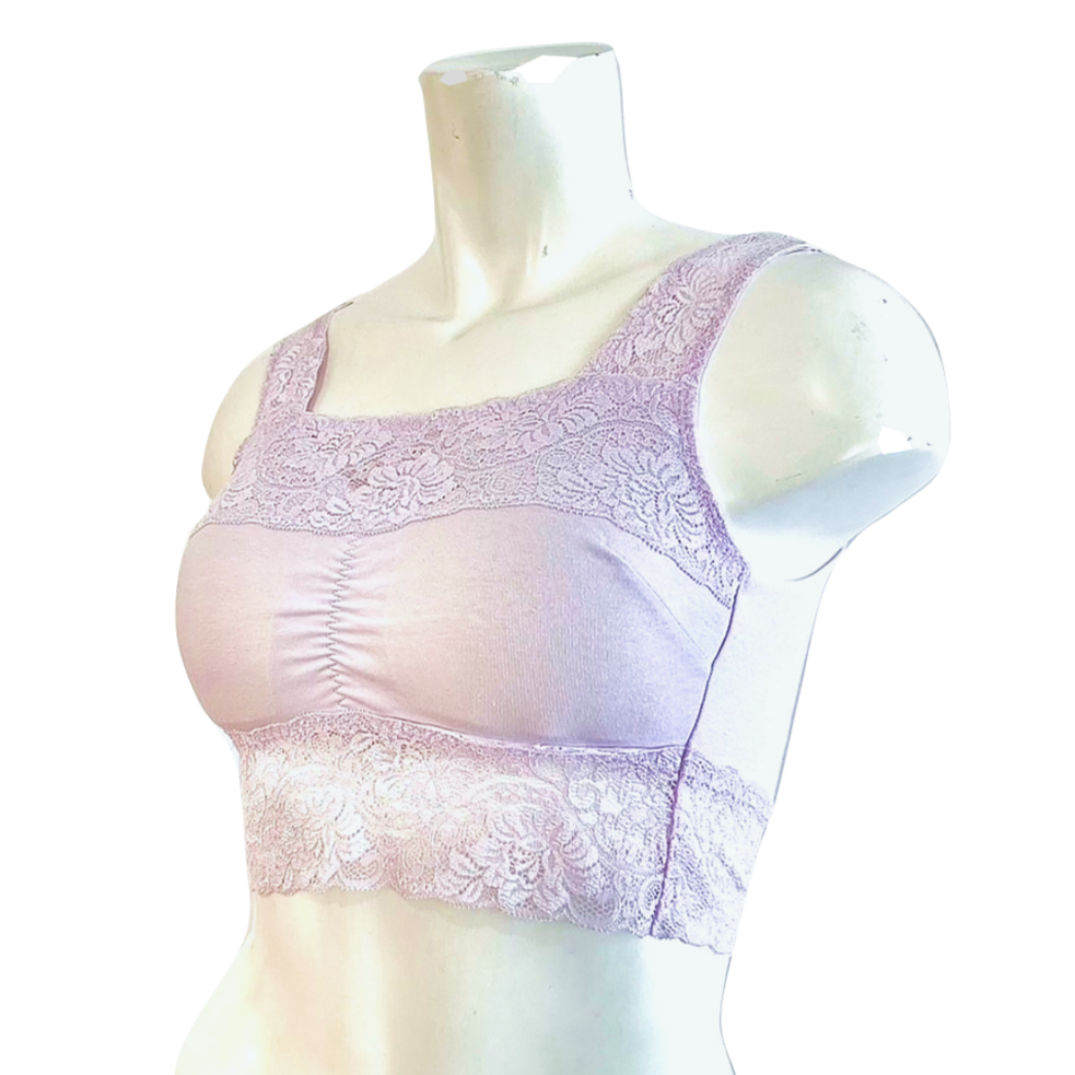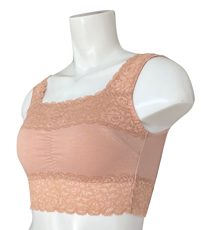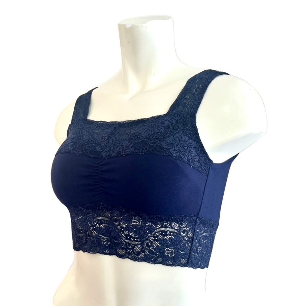 脇高でバスト全体を覆う安心感と、肩の広いストラップで負担を軽減。背中部分は縫目があたらない仕様になっており、アンダーをレースにする事で締付けを軽減した快適な着心地に。